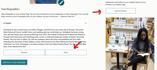 There’s an author photo, bio, display of all the books you have on Amazon next to your photo, and at the bottom. You can also add your blog feed to your page and videos.