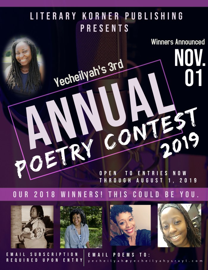 The first-place winner receives everything under 2-4th place with an exclusive publishing package courtesy of Yecheilyah Books LLC’s publishing arm Literary Korner Publishing. Yes, you heard me right! I will finance the publishing of your next (or first!) poetry ebook. As the grand prize winner, you get the following (in addition to everything else):