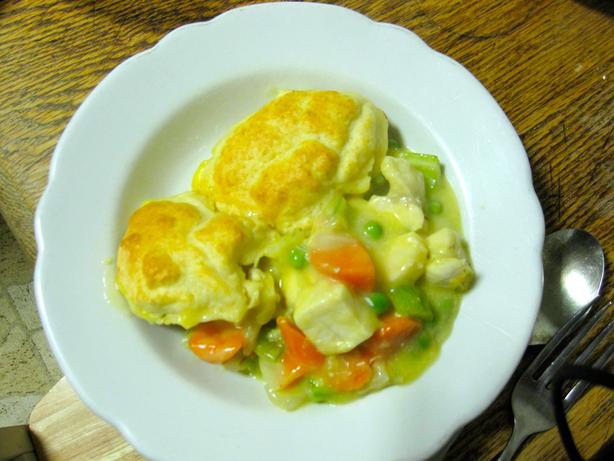 Mix chicken pieces, veggies and cream of chicken soup together and spread into bottom of greased pie pan or pan of choice (it tastes better if you use melted butter as a lubricant instead of regular spray oil). Also, when I’m making a large portion, I like to use a roasting pan in replace of a pie pan.