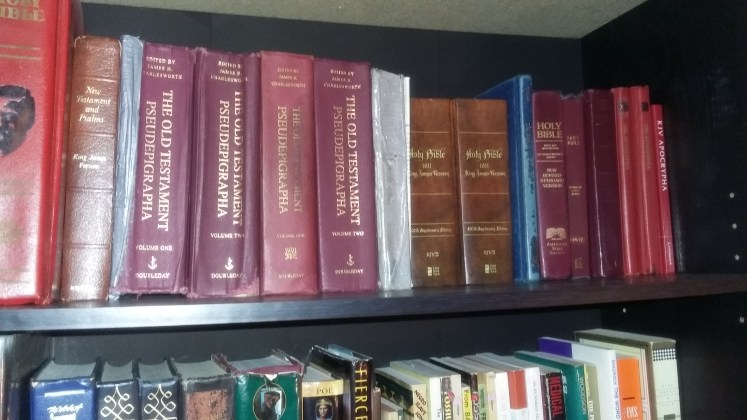 Bibles (starting with the gigantic one on the end there with the black man’s face on it) Apocrypha’s, The Book of Enoch, Old Testament Pseudepigrapha’s, The Book of Jasher, the 1611 version of the King James Bible, and the Scriptural Translation published by the Institute for Scriptural Research in South Africa.
