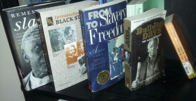 Remembering Slavery, Introduction to Black Studies, From Slavery to Freedom, Bullwhip Days and Roll of Thunder Hear My Cry which should be on the bookshelf in the other room where the novels are.