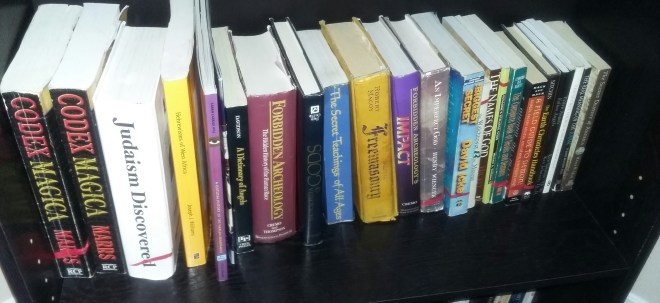 The next to the bottom of the bookshelf is the controversial shelf. More research, Masonry, Fallen Angels, The Watchtower and the Masons, Secret Teachings, Dictionary of Angels, etc. All the “Forbidden Knowledge” type stuff. So, yea, that.