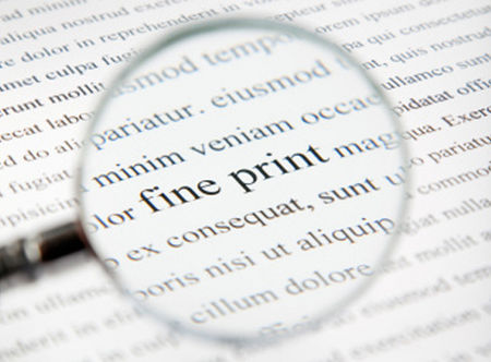 Fineprint – inconspicuous details or conditions printed in an agreement or contract