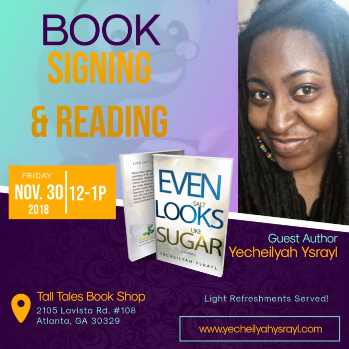 For those of you who do not have the new book, I am offering you an opportunity to come out to this event and celebrate with me. I will have signed paperback copies of Even Salt Looks Like Sugar and I’ll also be reading from the book. This is also a great time for a Q&A session. Is there something you would have liked to see happen in the story? Do you have a favorite part? Least favorite part? Ask me all the questions you want!