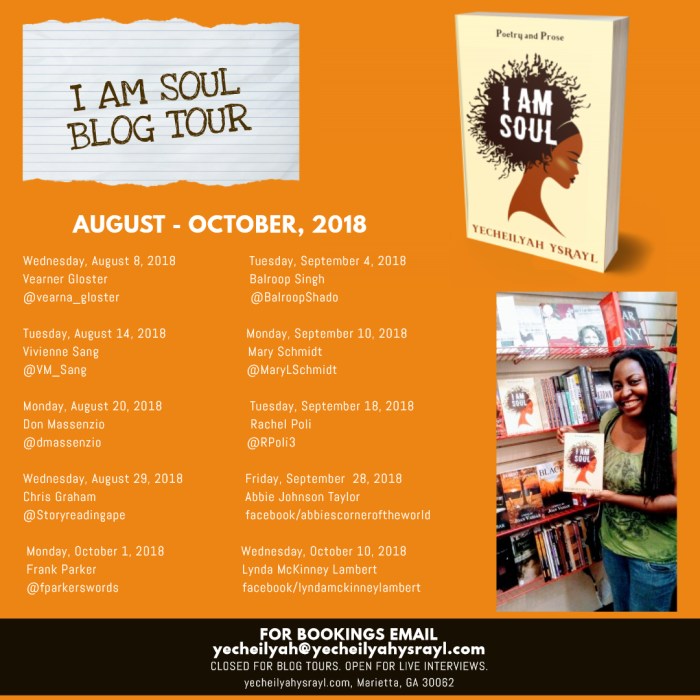 Don’t forget to join me tomorrow for the start of the I am Soul Blog Tour! I will be visiting a total of 10 blogs over the course of the next few months and introducing some of my poetry. Be sure you are following these blogs by clicking HERE. You don’t want to miss it!