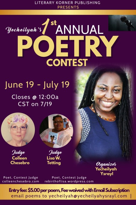 Submit one or two original, unpublished poems to Yecheilyah at yecheilyah ysrayl dot com (yecheilyah@yecheilyahysrayl.com) between now through July 19, 2017. You will have until 12:00 midnight Central Standard Time on 7/19 to get your poems in before closing.