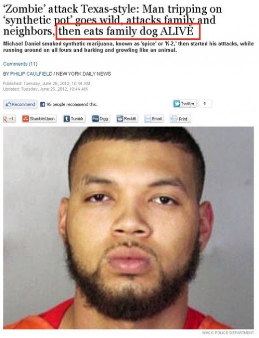 “On Saturday June 22, 2013 a man who’s friends said he was high on synthetic pot went wild and crazy. He stripped off his clothes and ran around the house on his all fours like an animal growling and screaming. At one point one of his friends locked the back glass screen door when the man went outside and the man screamed and then leaped through the locked screen door through the glass in the upper part of the door. He cut his chest and legs badly and was bleeding badly. He was scooping up his own blood with his hands and pushing it into his own mouth eating it. His friends terrier dog came into the kitchen and the screaming man beat the dog down with his fists and then tore it apart and ate it hair and all. Before the police and paramedics arrived on the scene the man had consumed most of the little terrier dog.”