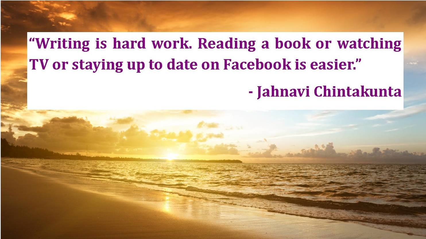 I like this quote because there’s a duality about it. On the one hand its just funny and yall know how silly I am. I also like it because it’s real. It does not sugar coat the truth. Writing is hard work and without the motivation, the discipline, or the drive to keep at it, it can easily fall by the way side. The other side to this quote, for me, is that it’s a subtle reminder not to allow these things, TV, and social media, to become such a distraction that it prohibits us from writing. When it does, it becomes time to cut off or separate that distraction until the work is done. I do not believe it is an option, but separation is mandatory when something becomes a hindrance if we are serious about staying focused on our writing endeavors. Speaking of life, Chintakunta is also an Indie Author! You can find out more about her book at the end of this post. In the meantime, here’s more about her.